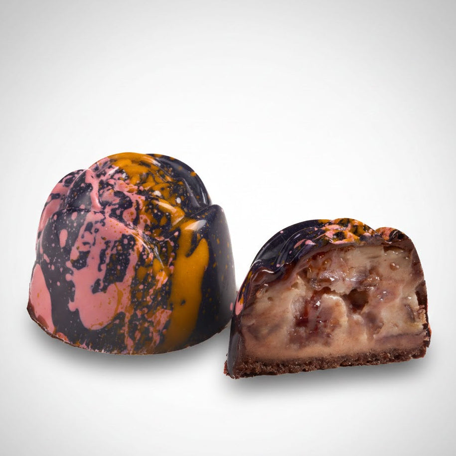 Nuestro bombón de frutos rojos combina la frescura y dulzura de fresas, frambuesas y arándanos, creando una experiencia única en cada bocado que combinado con nuestro delicioso chocolate 100% natural y libre de preservantes y aditivos, ofrecen un contraste perfecto que deleita los sentidos.